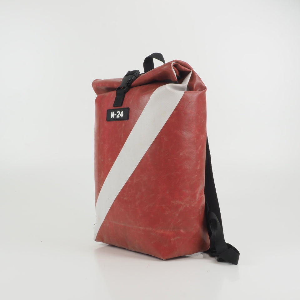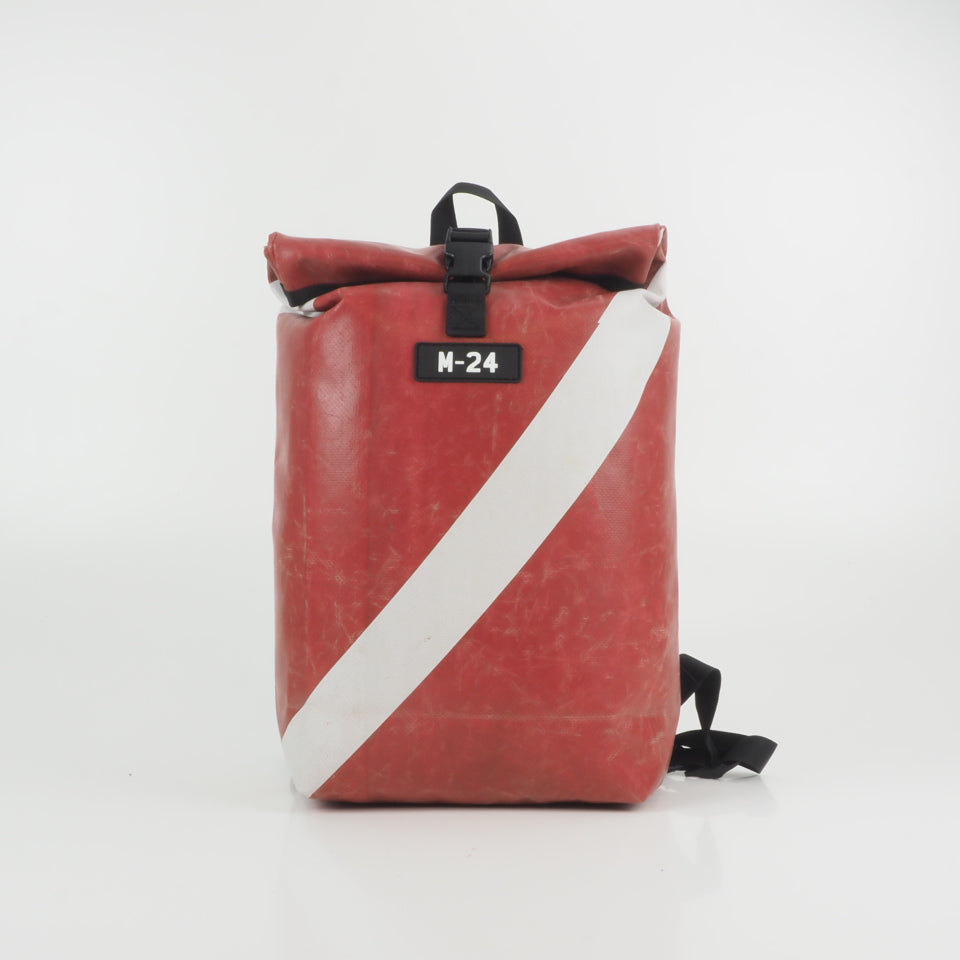 Our medium roll-top backpack is made from ultra-tough truck tarpaulin, giving it the durability you need for everyday use. It's waterproof enough to handle the elements (don’t submerge it) and has an 18-20 liter capacity, perfect for carrying your essentials.